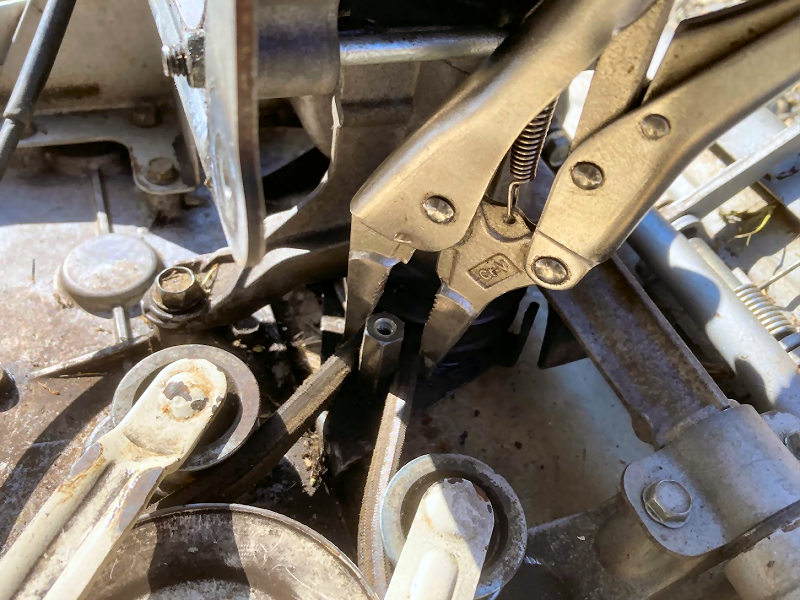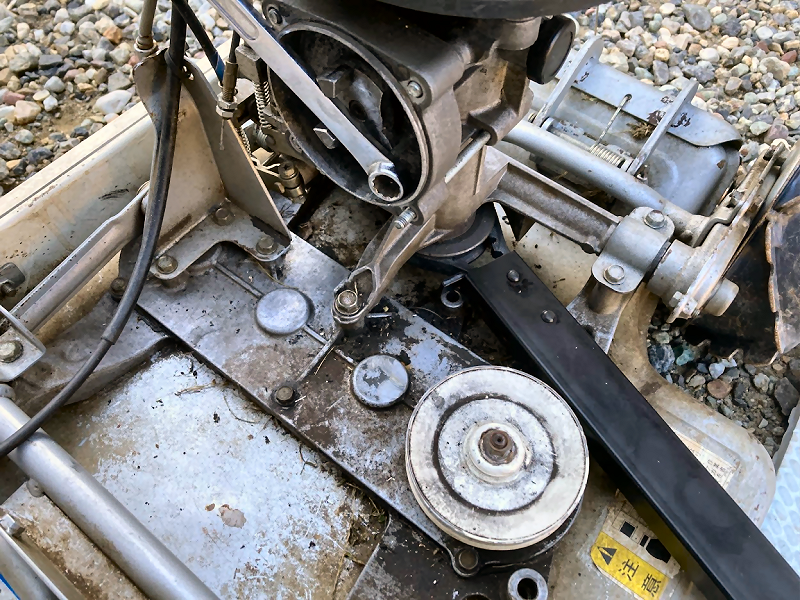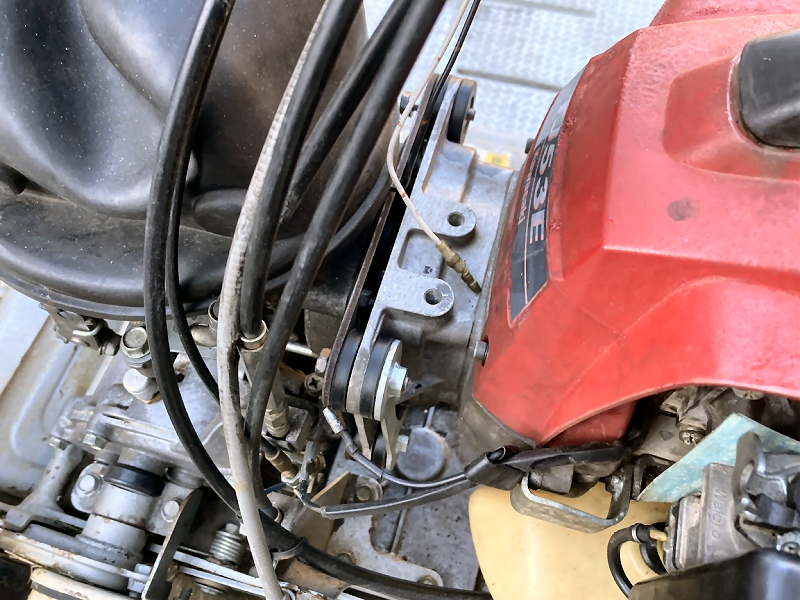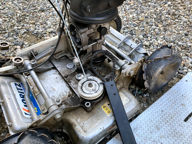 ミッション側のカップリングは回り止めがありません。 刈刃を駆動するベルトで回り止めにしようとしたのですが、滑ってしまってうまくいきません。 |
