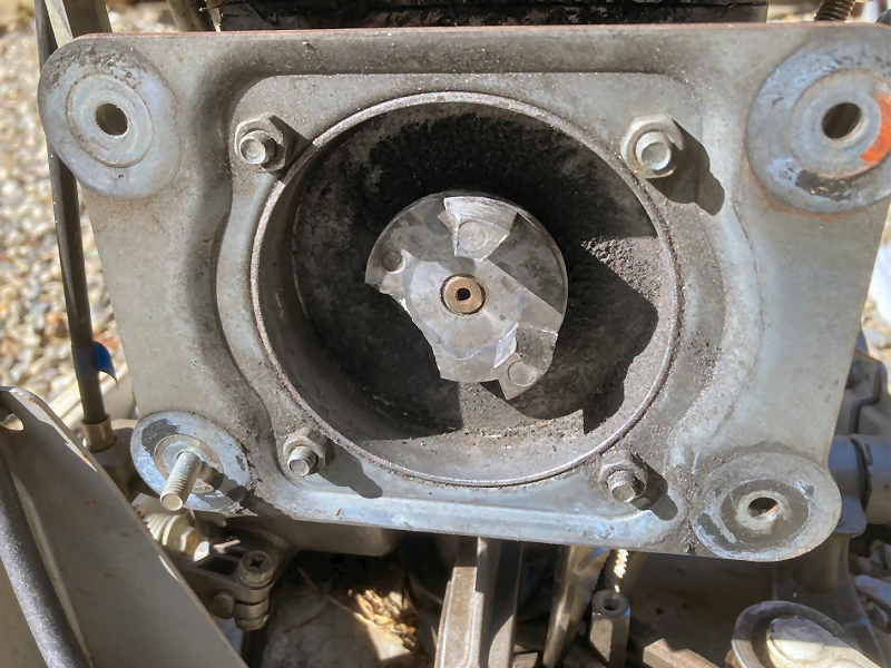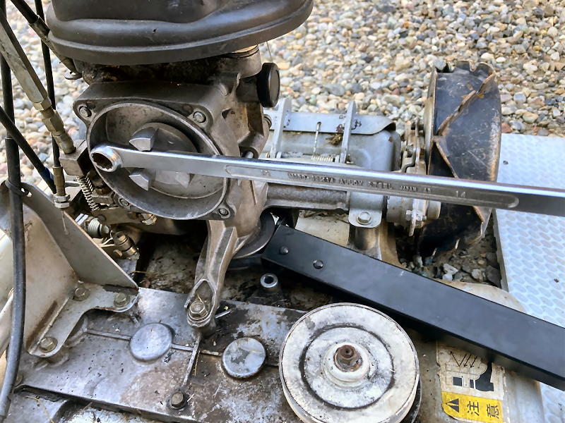 草刈り中にクラッチ付近からガラガラと音がしていたので、エンジンを取り外して原因を探します。 | |
