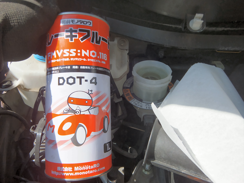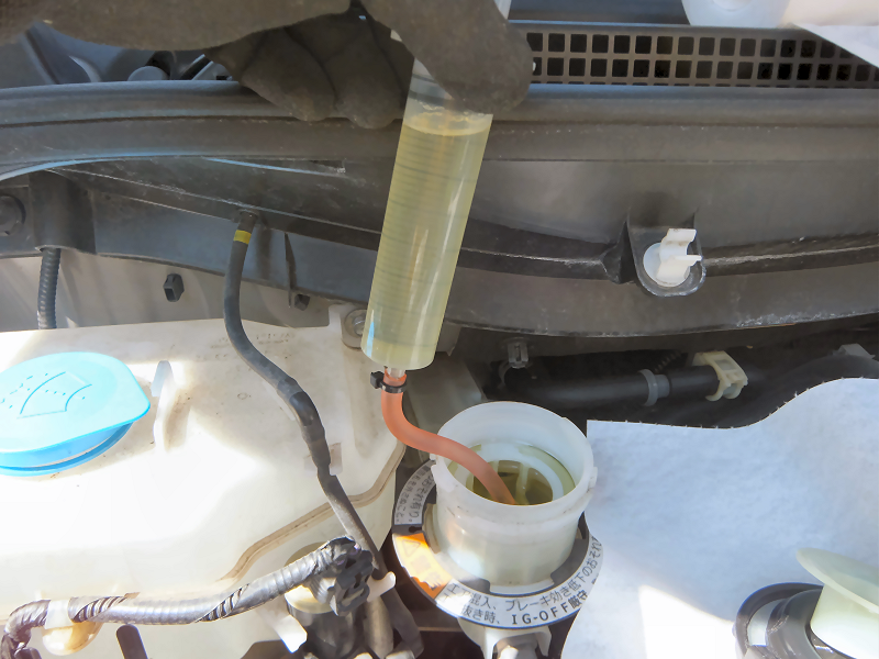 ブレーキフルードを交換します。 前回の車検の時にも交換しているので、少し色が付いた程度です。 |
