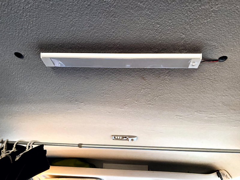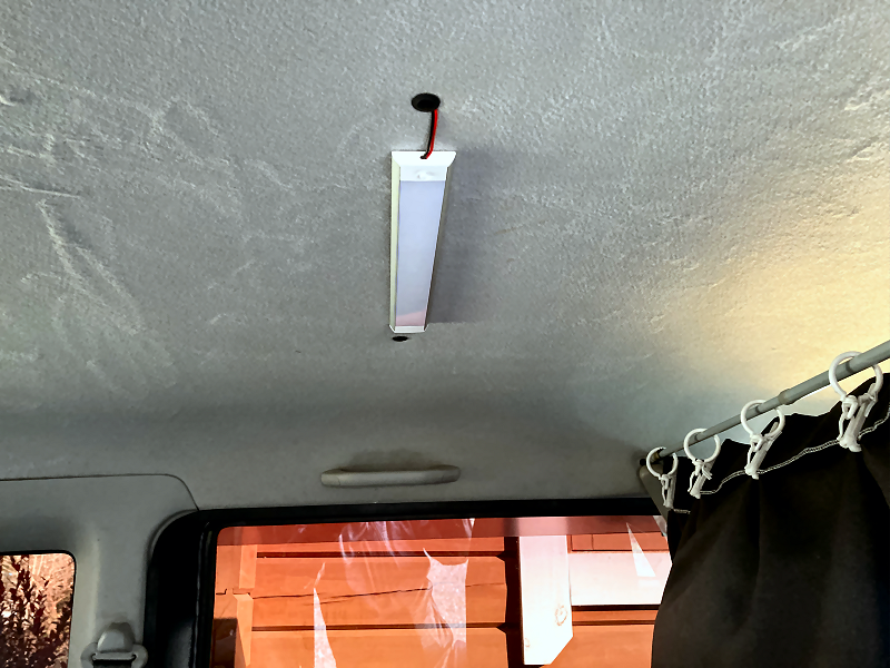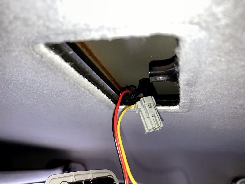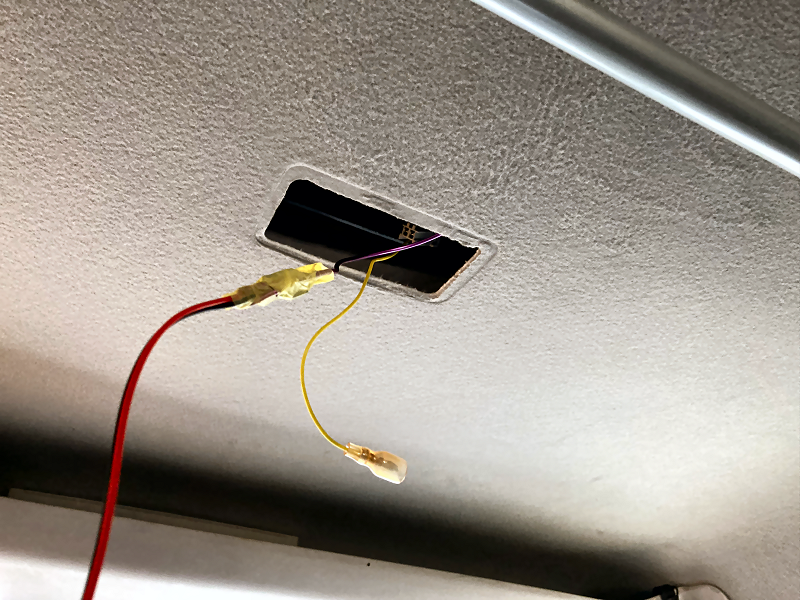 ルームランプを天井に取り付けます。 付属の金具を天井にビス留めします。 ビスは短いので天井の内張に固定されているだけです。 |