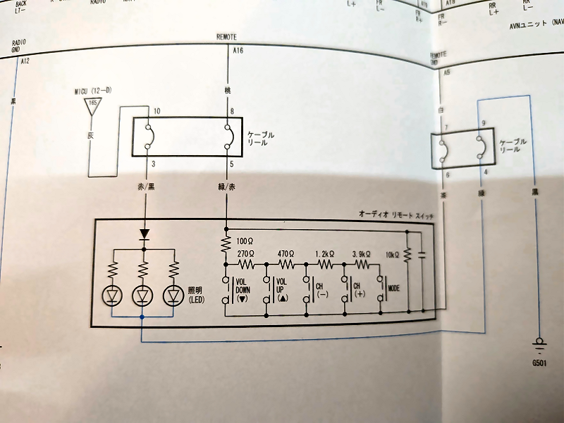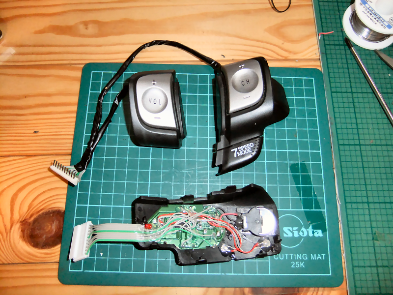 交換前のナビは赤外線リモコンで操作するタイプだったので、ステアリングリモコンも市販の学習リモコンを分解して組み込んでありました。 しかし新しいナビは純正ステアリングスイッチと有線で接続するようになっているので、そのままでは使えません。 |