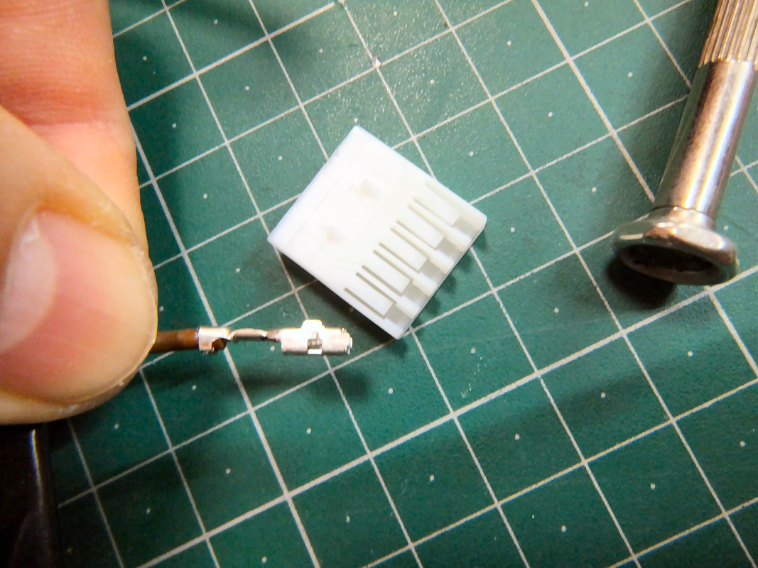 追加の配線のためにはコネクタのターミナル金具が必要になります。 コネクタを分解して金具の寸法を測りました。 |