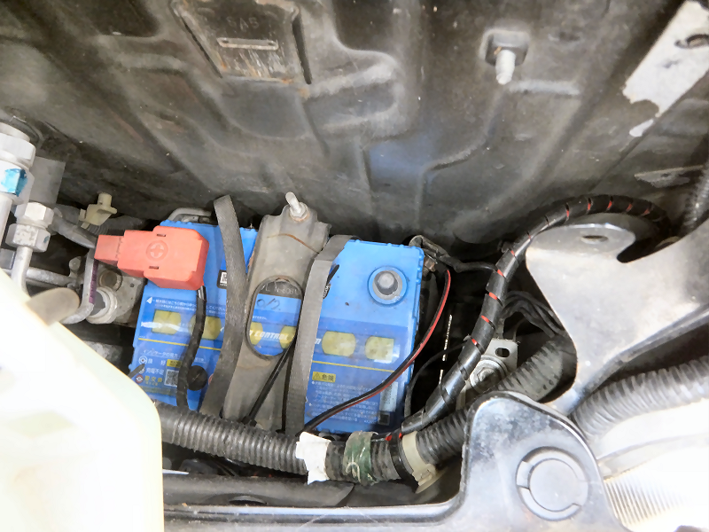 車体側のエアバッグの配線をいじるので、バッテーリーの−端子を外しておきます。 | |