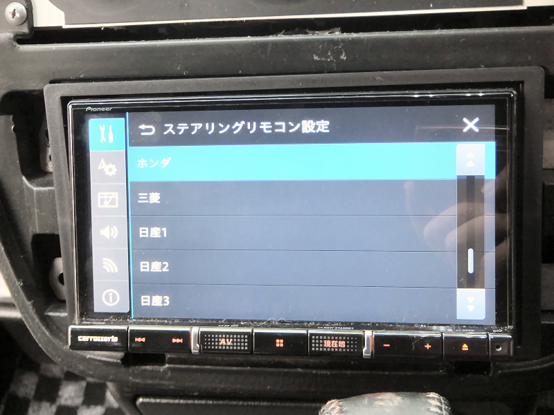 作成した回路はフィット純正と同じになっているので、ナビのステアリングリモコンの設定は「ホンダ」を選びます。 | |
