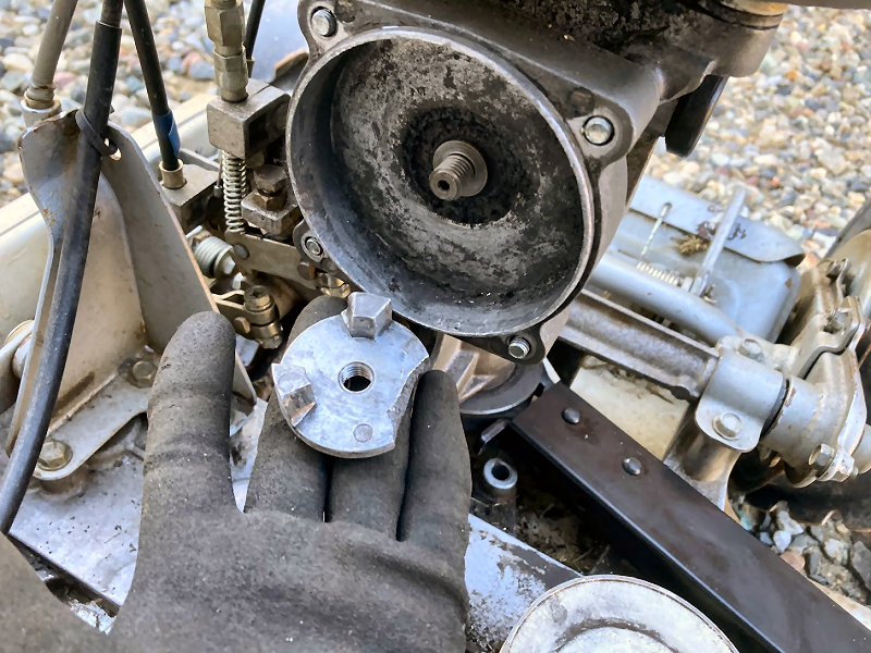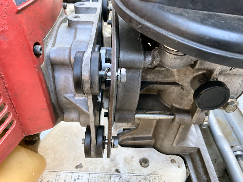ミッション側のカップリングは回り止めがありません。 刈刃を駆動するベルトで回り止めにしようとしたのですが、滑ってしまってうまくいきません。 |
