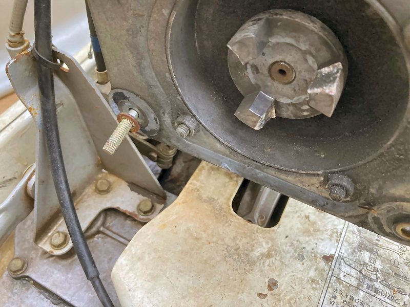 草刈り中にクラッチ付近からガラガラと音がしていたので、エンジンを取り外して原因を探します。 | |