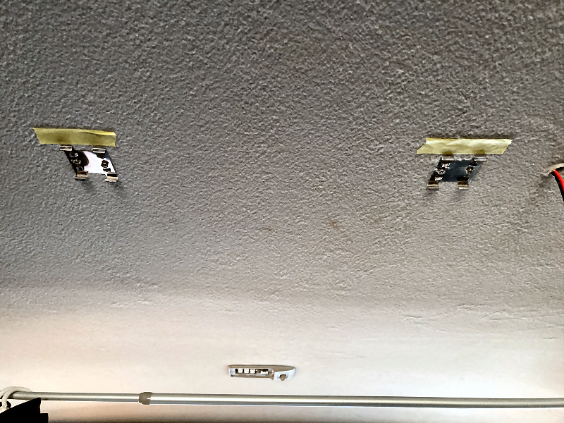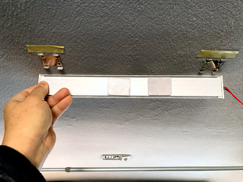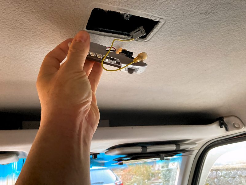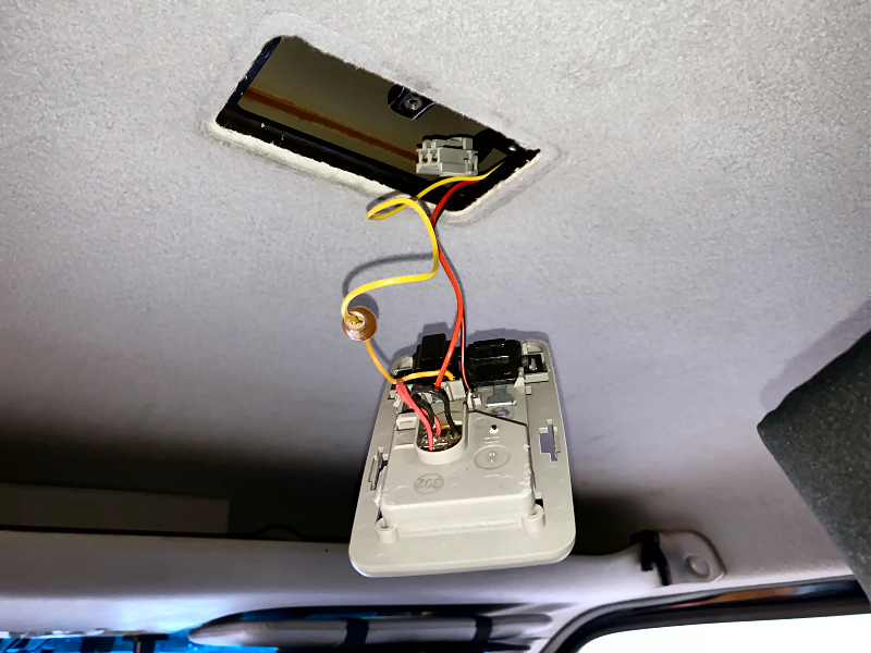 ルームランプを天井に取り付けます。 付属の金具を天井にビス留めします。 ビスは短いので天井の内張に固定されているだけです。 |