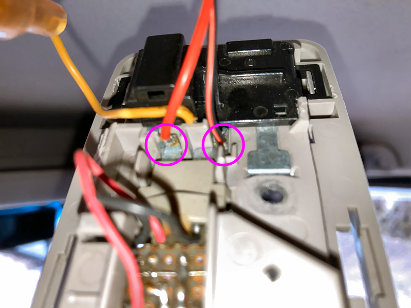 追加ルームランプ用の配線を○印の2カ所に半田付けします。 | |